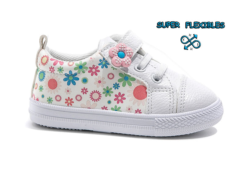 Zapatilla infantil, primeros pasos, tipo respetuosa fabricada en material sintético de acabado muy blandito y suave al tacto. Cierre de velcro y elásticos.