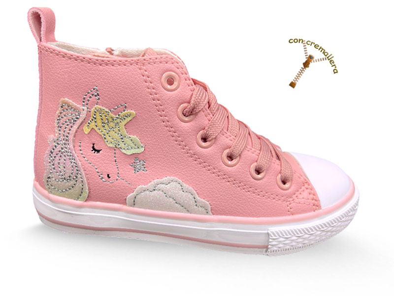 Bota infantil de polipiel con un bonito diseño de unicornio bordado en el lateral. Forro y plantilla extraíble textil.